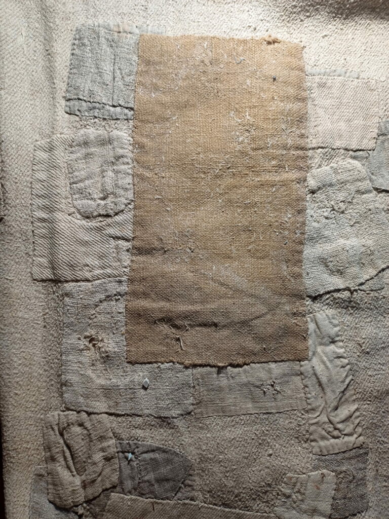 J’ai retrouvé un de ces sacs qui servaient pour les patates ou pour les pommes. Il est aujourd’hui précieusement rangé à l’abri au fond d’un placard. Ce sac, je l’ai pris dans mes bras, je l’ai lavé dans un lave-linge. J’ai passé ensuite une heure à nettoyer les filtres encrassés de la machine. Ce sac n’est pas un objet banal. C’est un incroyable patchwork de pétaçous, de telle sorte que la surface rapiécée est bien supérieure à la surface saine, ou plutôt que la partie saine n’est qu’un petit bout parmi tout le reste. Je me suis mis en devoir de compter le nombre de reprises. Il a fallu pour cela changer de braquet et utiliser la méthode scientifique. Le sac fut méticuleusement déplié sur une surface plane et lisse, d’abord un coté puis l’autre, et de chaque côté les morceaux de toile, de rugosités variées, superbe camaïeu de beiges, furent marqués un à un avec des boutons. Les boutons furent comptés, pour arriver après plusieurs essais au chiffre définitif de soixante-dix.